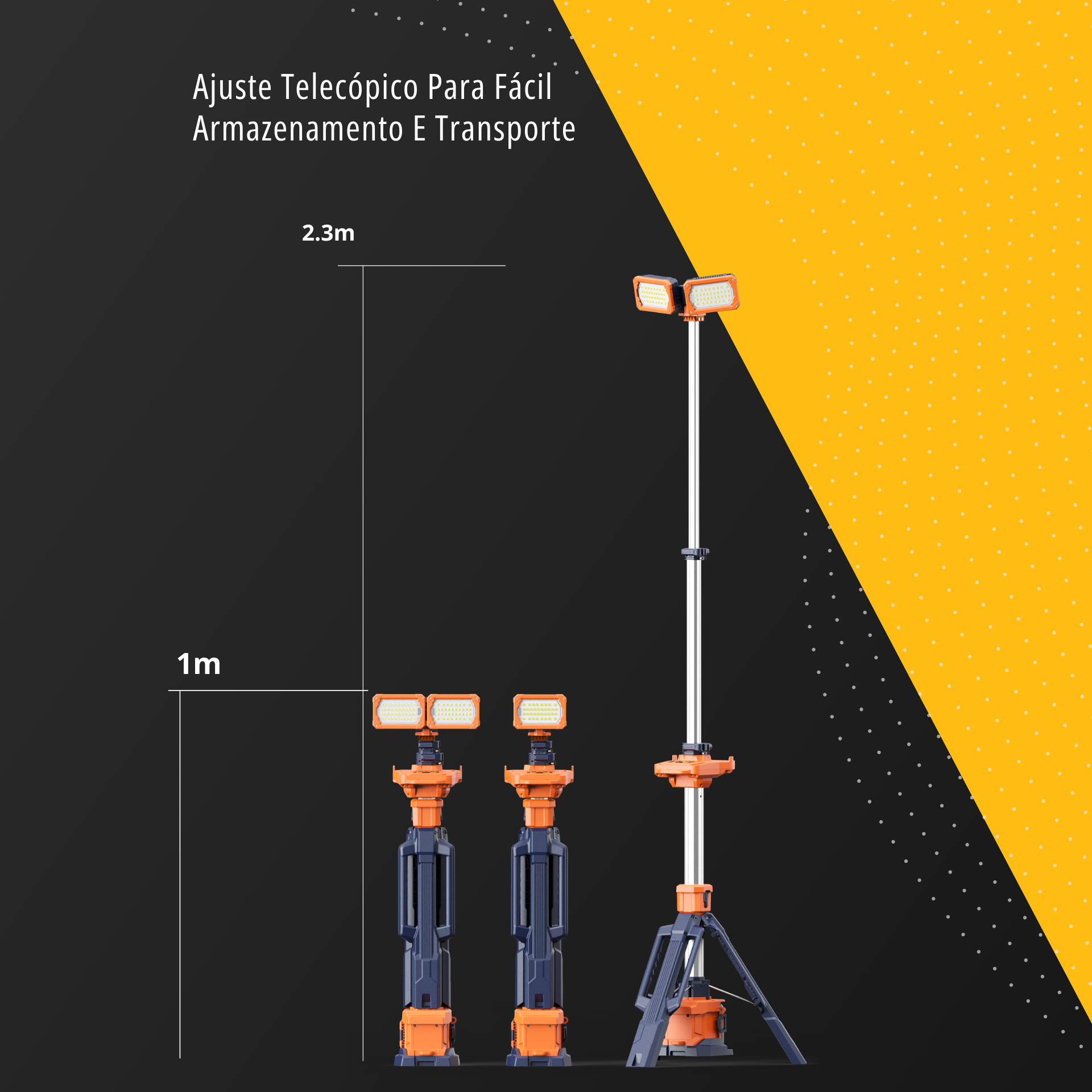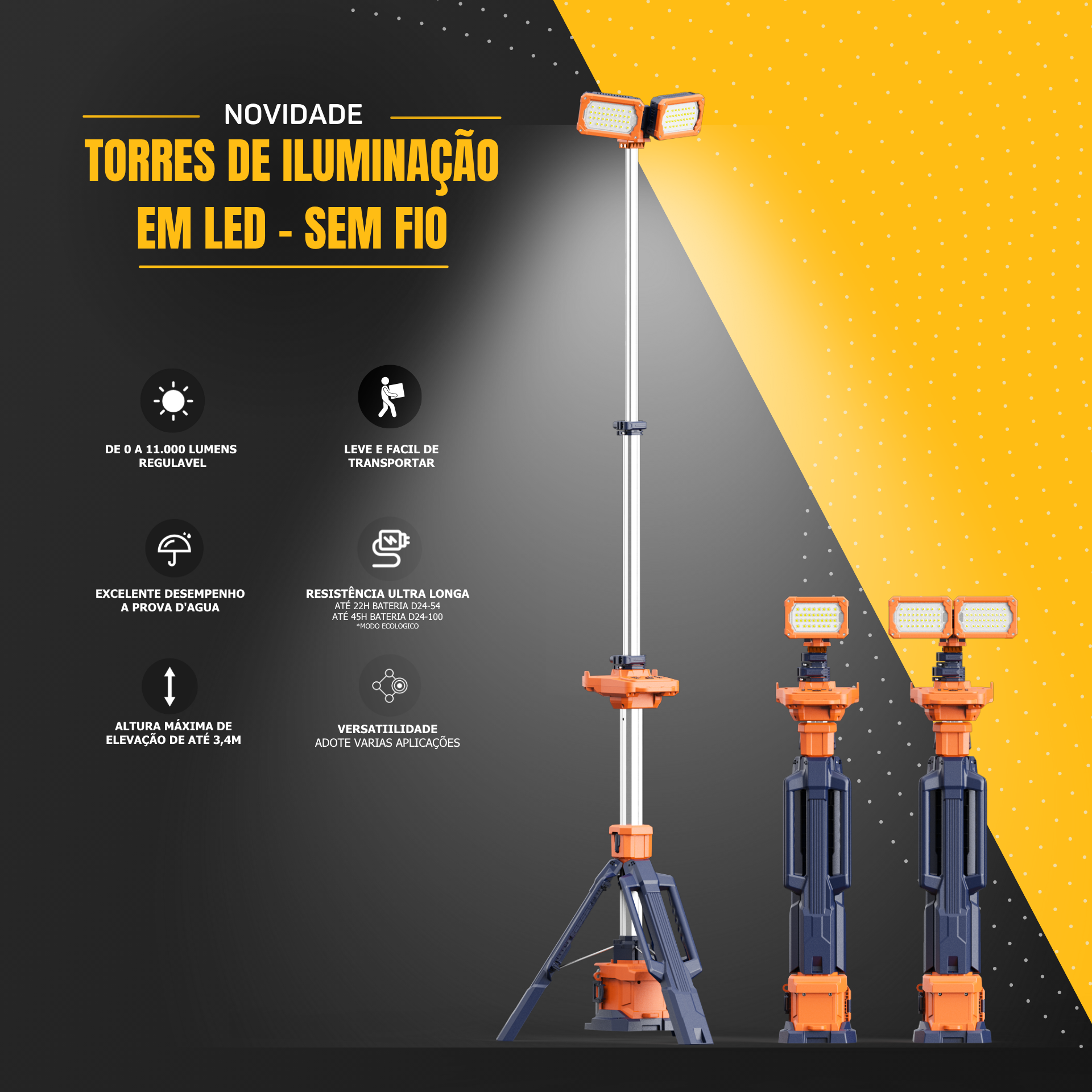 Equipamento compacto, resistente e altamente portátil, ideal para fornecer iluminação eficiente em locais de difícil acesso ou com pouca infraestrutura elétrica. Com estrutura leve e à prova d’água, pode ser transportado, montado e operado por apenas uma pessoa.