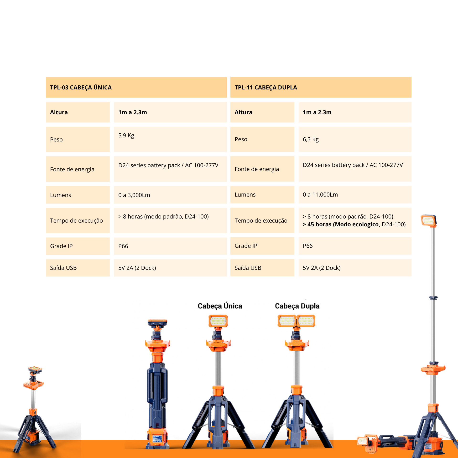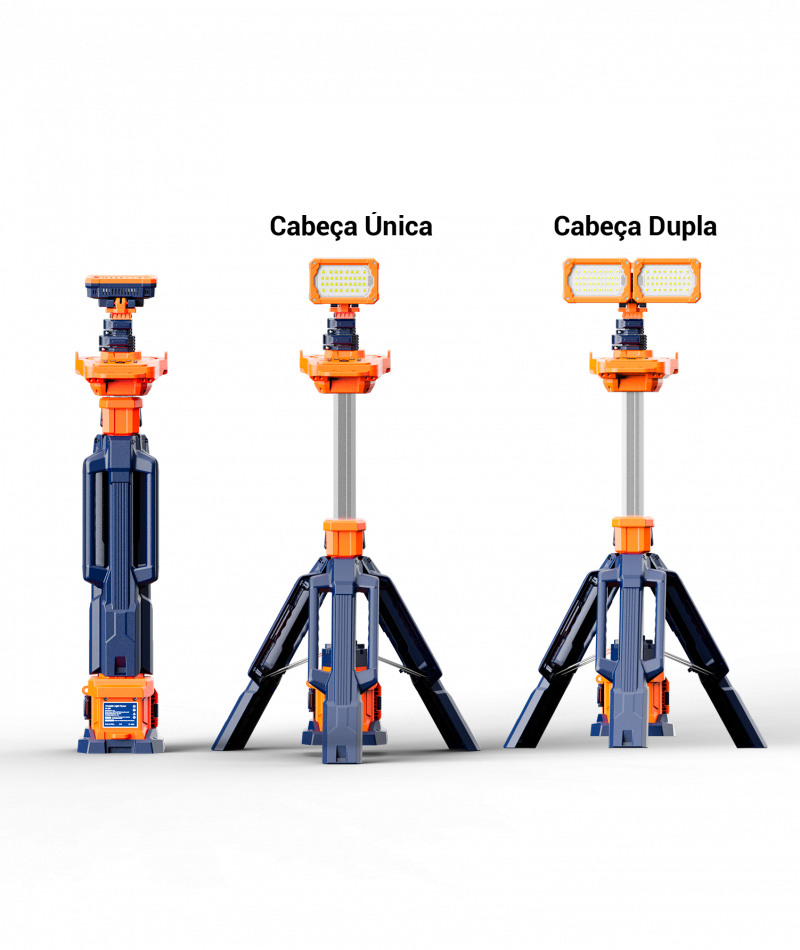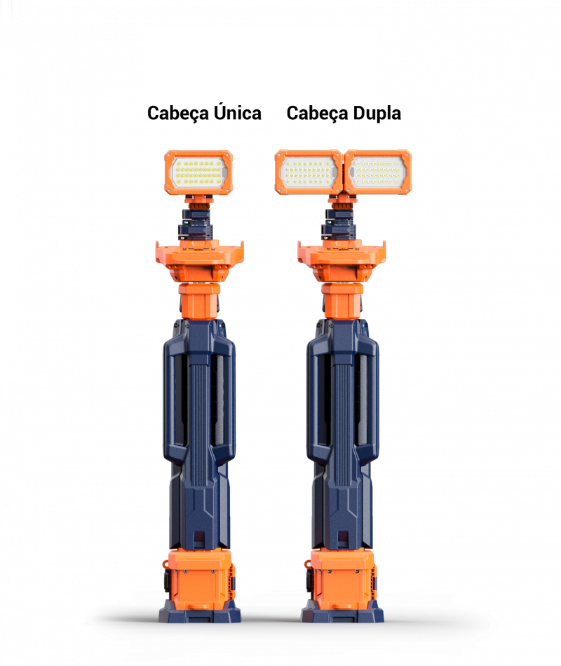 Disponível nas versões com cabeça única TPL-03 (até 3.000 lúmens) e cabeça dupla TPL-11 (até 11.000 lúmens), ambas com operação em bateria ou energia elétrica.